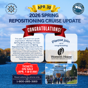 Please join us in congratulating Women’s House Serving Bruce & Grey as the non-profit organization that will be fundraising onboard the MS Chi-Cheemaun for our 2026 Spring Repositioning Cruise!