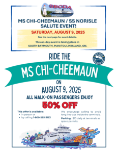 Exciting activities have been planned all day Saturday, August 9th in South Baymouth, Manitoulin, ON. The MS Chi-Cheemaun is offering walk-on passage for 50% off all day. Please book ahead of time to avoid terminal line-ups by calling 1-800-265-3163.