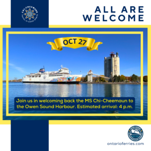 Owen Sound, Ont. – With the 2025 sailing season wrapping up, we invite the community to join us in welcoming the MS Chi-Cheemaun back to her winter berth at the west wall of the Owen Sound Harbour. The iconic ship is scheduled to arrive at approximately 4:00 p.m. on Monday, October 27, 2025.