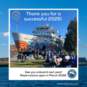 As 2026 approaches, we look ahead to another exciting sailing season. Beloved experiences like the Spring Repositioning Cruise and the Play for Passage program will return—along with opportunities to explore, connect and journey across Georgian Bay. Reservations for the 2026 season will open in March, with daily sailings scheduled from May 1 through October 18, 2026. Please note that these dates are subject to confirmation. For the latest updates, please visit our website www.ontarioferries.com as the season approaches. We look forward to seeing you onboard next year!