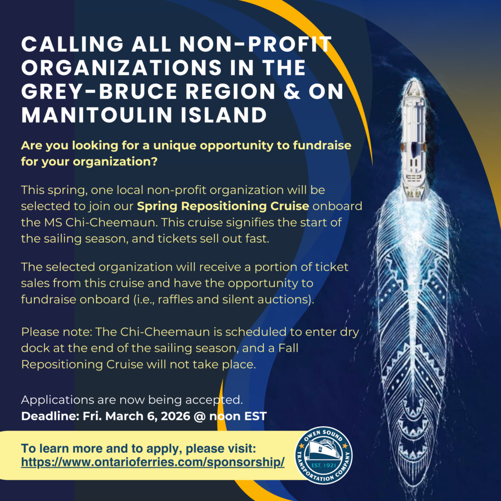 Once a year, the Owen Sound Transportation Company (OSTC) accepts sponsorship application forms for our Repositioning Cruises. The selected organizations will receive 10% of the gross ticket sales from their respective cruise and have the opportunity to fundraise onboard (i.e., raffles and silent auctions). Please note, 50/50 draws are not permitted.